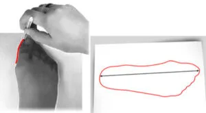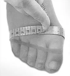 Całym ciężarem ciała stanąć na stopie i na wysokości 22 cm zmierzyć obwód pod łydką.